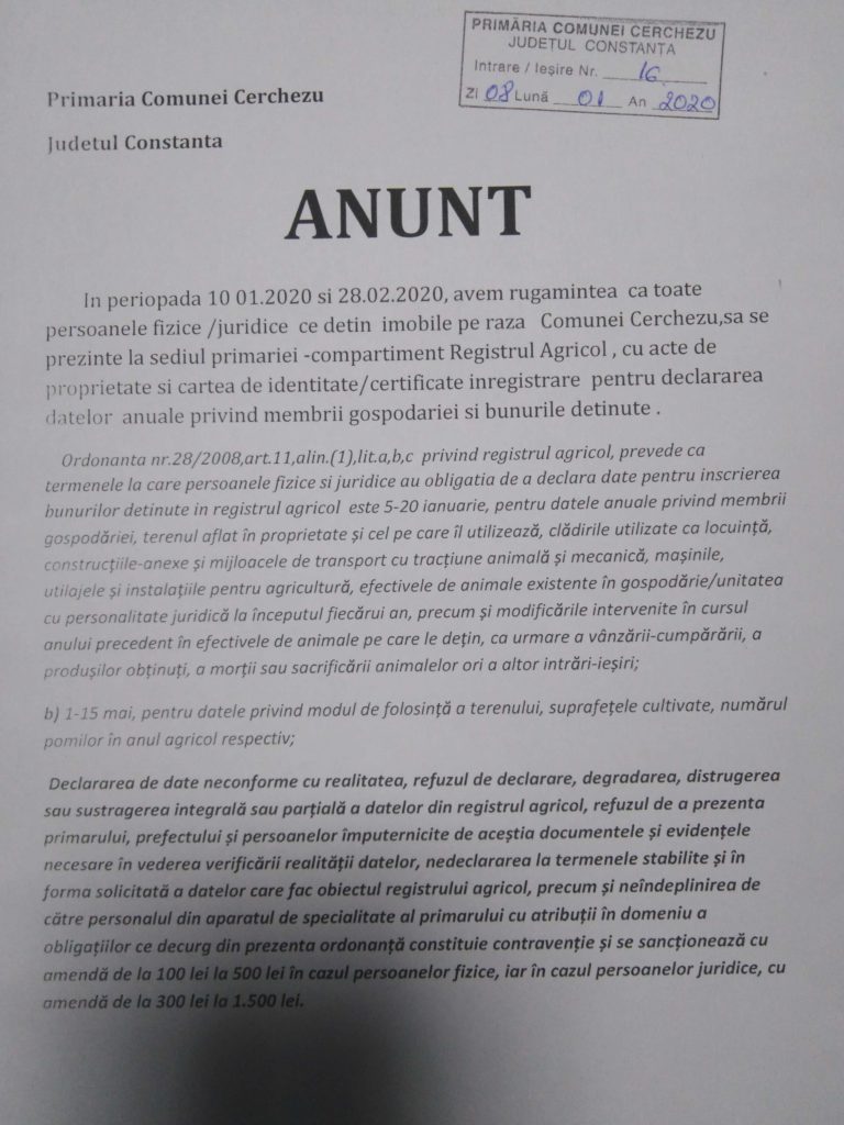 Informare pentru cetatenii comunei Cerchezu privind completarea registrului agricol