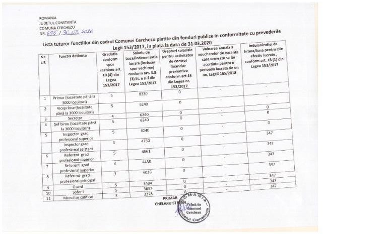 Lista tuturor functiilor publice din cadrul Primariei com Cerchezu, la data de 31.03.2020